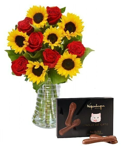 Girasoles de lujo, rosas colombianas y lengua de gato Hermoso Arreglo en Florero de Vidrio Transparente con 6 Lujosos Girasoles y 6 Lujosas Rosas Rojas Colombianas. Viene con una caja de deliciosos chocolates con leche, lengua de gato Kopenhagen, 85 g. ¡Perfecto como regalo para tu ser querido!