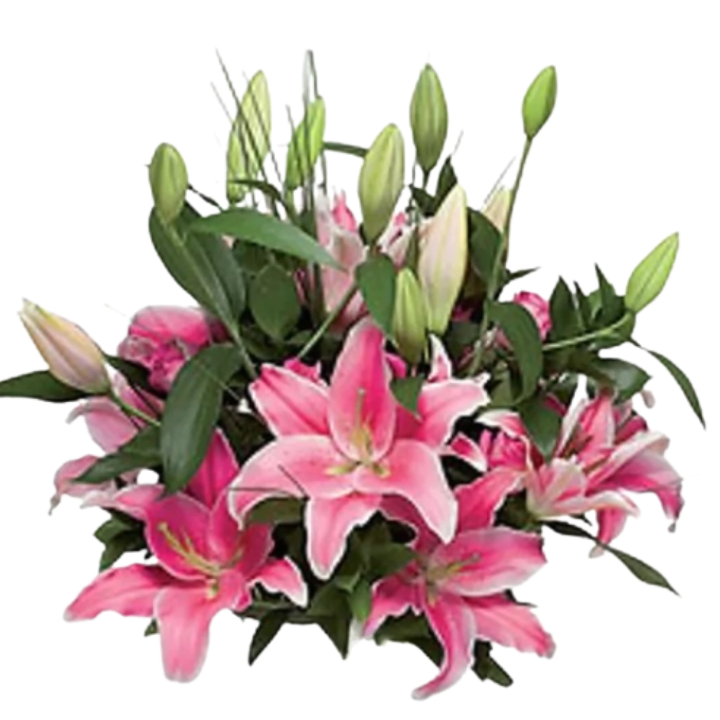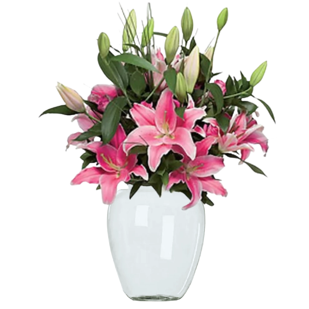 Jarrón de vidrio elaborado con lirios rosas y follaje. Colección exclusiva de Floresnet. Colección exclusiva Floresnet.