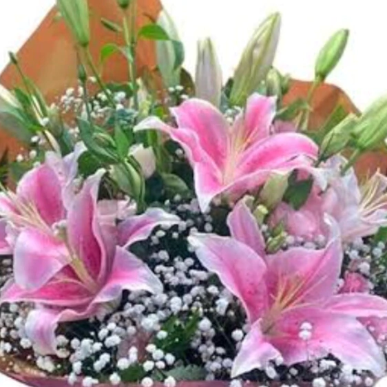 Ramo de lirios rosas envuelto en papel decorativo, celofán cristal y atado con cinta de raso. Festival de Lirios. Selección exclusiva de Floresnet.