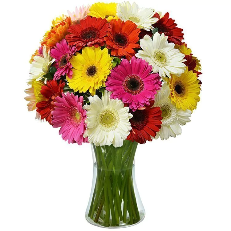 Vaso 20 Gérberas Coloridas, arranjo em vaso em vidro da Cristaleria Bruxelas, confeccionado com 20 flores de Gérberas Coloridas.