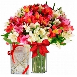 Alstroemerias Mix and Assorted Chocolates, an arrangement made in a square glass vase with satin ribbon, featuring 12 stems of colorful alstroemerias flowers.