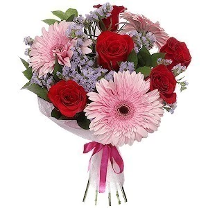 Bouquet made with 6 National Red Roses, 6 Pink Gerberas and Statícia or Silver Rain flowers. Packed in ornamental paper and satin ribbon bow.