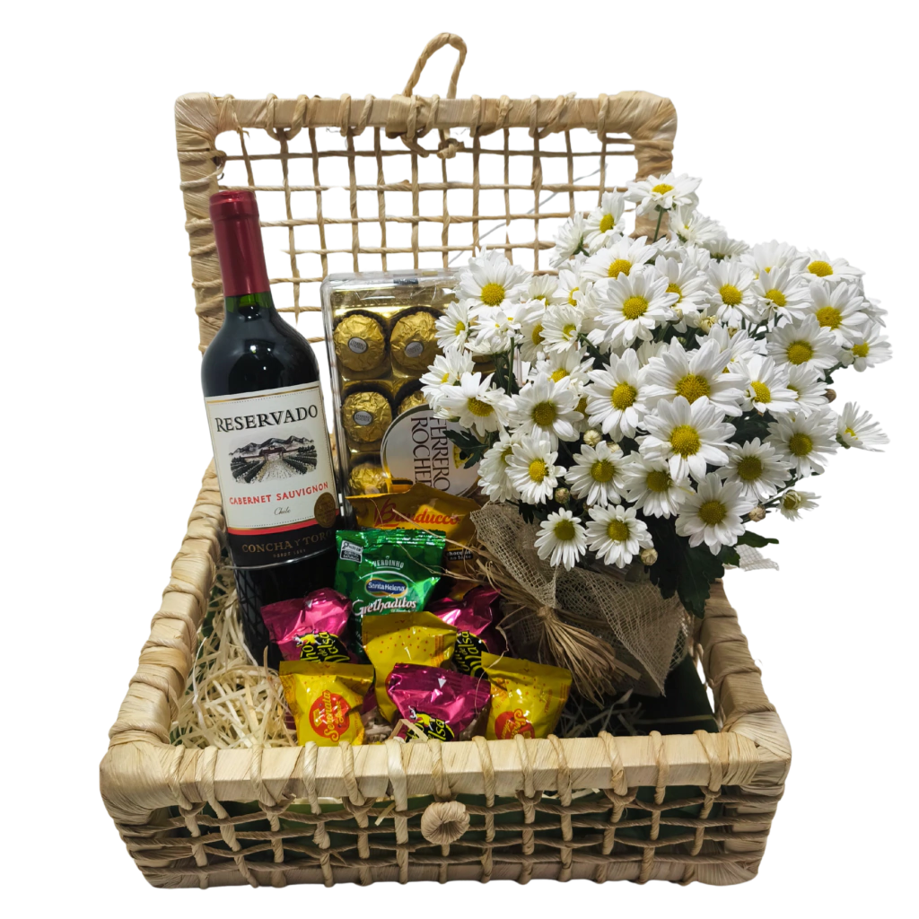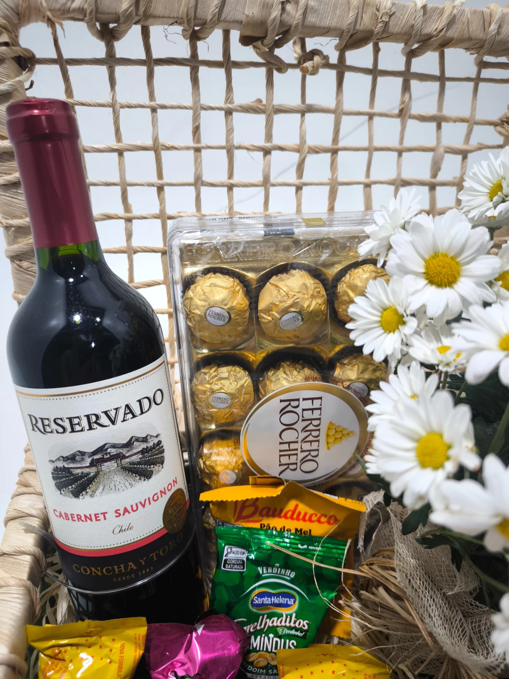Spectacular Day Chest Basket, made in a Corn Straw Chest, Cocha y Toro Red Chilean Wine, 750ml, Ferrero Rocher Chocolate Box 150g, 3 Sonho de Valsa Chocolates and 3 Serenata do Amor Chocolates, Peanuts, Bauducco Honey Bread 15g, 1 vase of Delicate Planted Flowers.