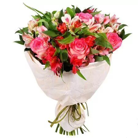 Buquê confeccionado com 6 Rosas Cor-de-Rosa e Flores de Alstromérias Cor-de-Rosa , embalado em papel especial e laço em fitas de cetim.